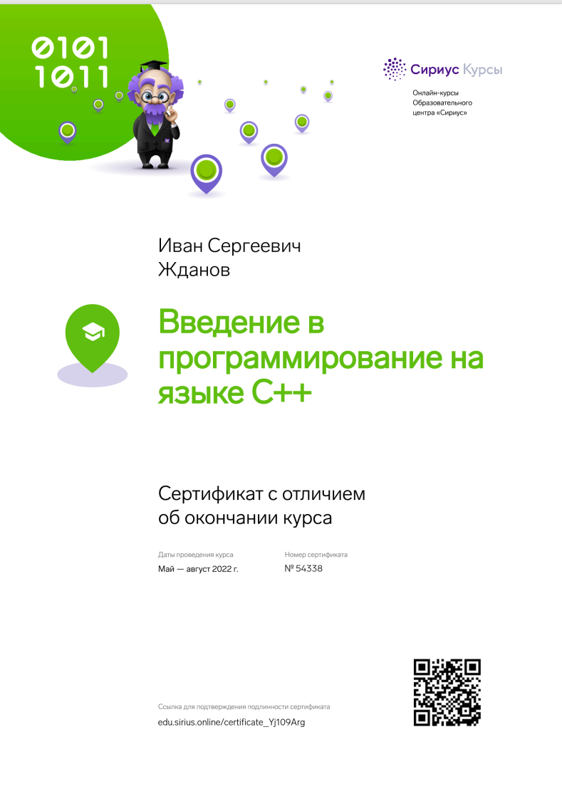 При прохождении курсов С++, я научился на профессиональном уровне писать на нем код, что мне дало твердую базу для изучения программирования в дальнейшем. Сертификат